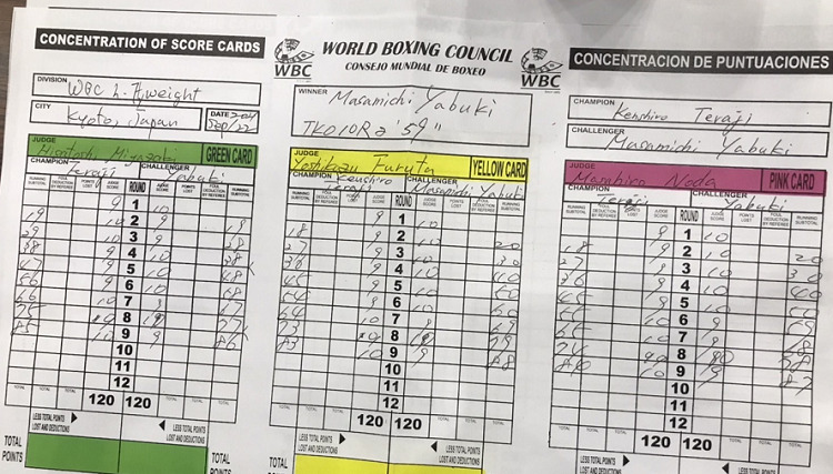 拳四朗は9回、ようやくボディ攻撃で矢吹を追い込んでいく。苦しそうな矢吹をロープに追い込んでラッシュ。大逆転の予感が流れ出すが、矢吹は攻め込まれながらも効果的にカウンターを打ち込んで崩れない。拳四朗は矢吹のパンチで右まぶたを大きくカット。流血が激しい。