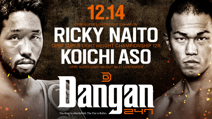 DANGANは1日、12月14日に後楽園ホールで開催する「ガッツファイティング&DANGAN247」のカードを発表。メインで日本S・フェザー級王者の坂晃典(仲里)が木村吉光(志成)とOPBF同級王座決定戦を行い、セミでOPBF・S・ライト級王者の内藤律樹(E&Jカシアス)が同級11位の麻生興一(三迫)と5度目の防衛戦を行うことになった。