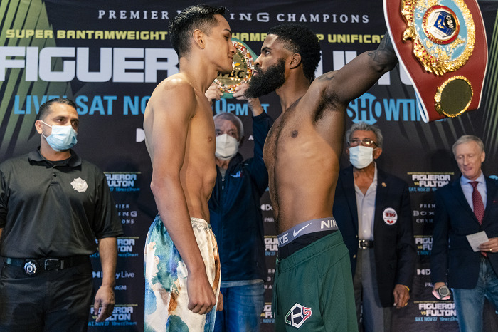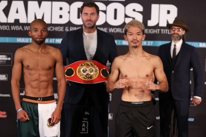 明日27日(日本時間28日)ニューヨークのHuluシアターで開催されるライト級4団体統一タイトルマッチの計量が26日行われ、統一王者テオフィモ・ロペス(米)がリミットの135ポンド(61.23キロ)、IBF指名挑戦者ジョージ・カンボソス(豪州)は134.4ポンド(60.96キロ)をマーク。開始ゴングを待つことになった。
