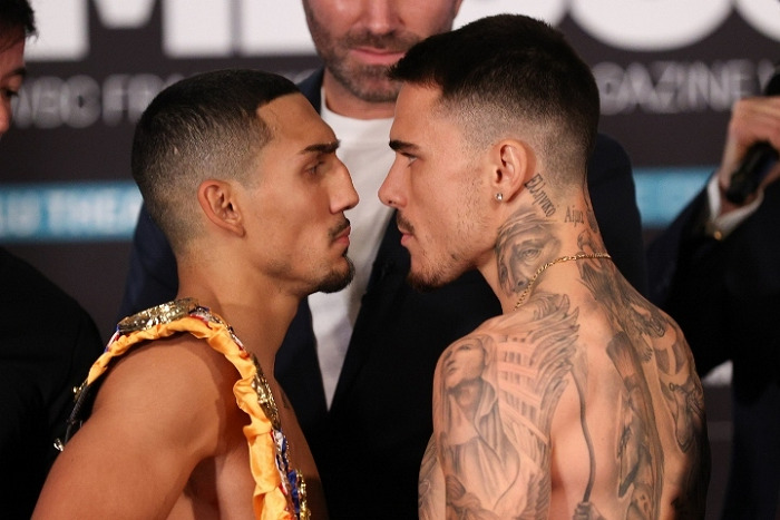 明日27日(日本時間28日)ニューヨークのHuluシアターで開催されるライト級4団体統一タイトルマッチの計量が26日行われ、統一王者テオフィモ・ロペス(米)がリミットの135ポンド(61.23キロ)、IBF指名挑戦者ジョージ・カンボソス(豪州)は134.4ポンド(60.96キロ)をマーク。開始ゴングを待つことになった。