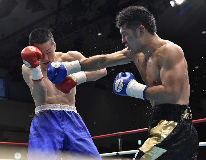 白井・具志堅ジムから移籍初戦の屋嘉部が4回、サウスポー村上を右でダウン。再開後も強打で詰めてストップした。屋嘉部は4勝4KO2敗。村上は1勝1敗。
