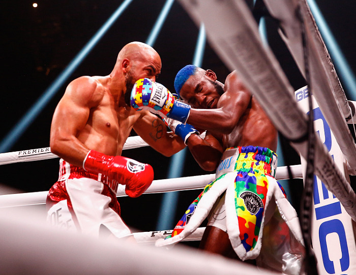 前半5回を終えて公開された途中採点は3ジャッジとも50-45で王者がリード。粉川はなおも手を出し続けたが、時折脇腹にフックを決めたものの、顔面へのブローは阿久井のガードを突き破れない。