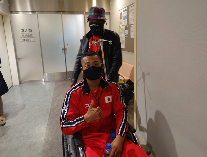 試合直後、写真撮影をしている際に倒れ込み、セコンド陣に抱えられて控え室へ。「下半身が動かない」と訴えて病院に搬送された。写真=大橋ジム提供