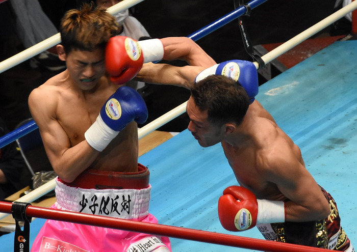 前半5回を終えて明らかにされたスコアは48-47、49-46、47-48の2ー1で赤コーナーの川崎が優勢。試合は近場での攻防が続いた。互いにアッパー、左ボディフックなどでアピールし続けるが、どちらも決定的なチャンスはつかめない。