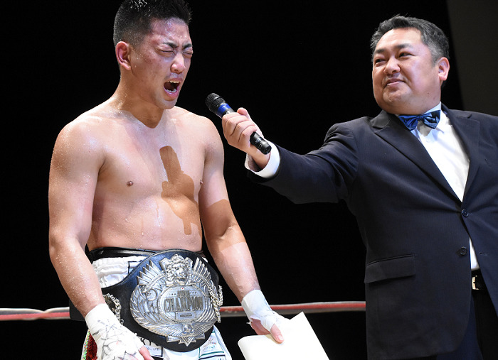ベルトを巻いた国本は「ずしりと重いですね」と笑顔。「国内最強になるのが目標です」とOPBF、WBOアジアパシフィックのタイトルを狙っていく構えだ。