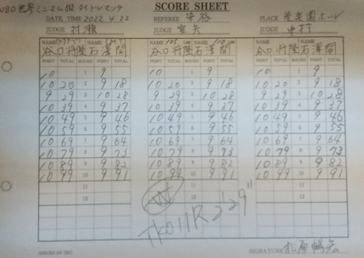 両者は19年9月、日本タイトル挑戦者決定戦で手を合わせて谷口が判定勝ち。舞台を世界タイトルマッチに変えてのリマッチ。様子見の初回をへて2回、石澤がプレスを強めていくが、サウスポーの谷口がサイドに動いていなしながら、左ボディ打ち。3回は石澤が右を決めてコンビネーションを決め、パンチの交換が激しくなってきた。