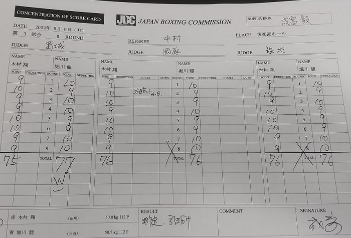 最終回も木村の動きは鈍く、堀川も詰めきれずにフィニッシュ。読み上げられたスコアはドロー。自己採点は「20点か30点」と試合後に口にした木村は19勝12KO3敗3分。判定を聞いた瞬間、キャンバスに大の字になって悔しがった堀川は3勝1KO1敗2分。