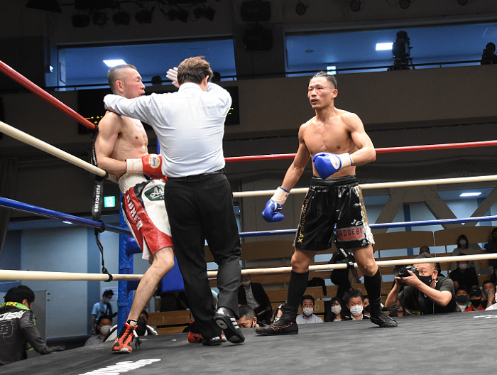 サウスポーの中井が初回、接近戦を仕掛けて体をぶつけ合う立ち上がり。2,3回は出入りのボクシングでコツコツとパンチを当ててペースを引き寄せていく。日本12位の高畑はボディ打ちで状況を打破しようとするが、機動力で上回る中井のペースは落ちず、4回には高畑をコーナーに押し込んで連打を見舞った。5回、中井が再び連打で追い詰めたところでストップとなった。中井は4勝2KO1敗1分。42歳の高畑は17勝7KO10敗1分。