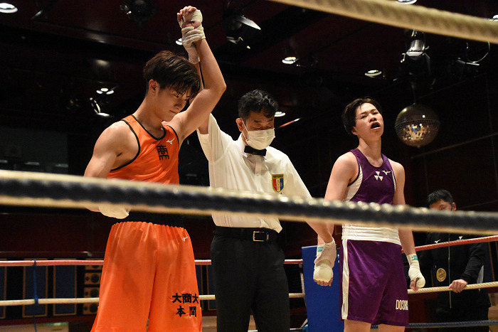 中重量級で同大に追い上げられたものの、ウェルター級で本間虹人が和田岳大を接戦の末破り、大商大の勝利が決まった。同大もL・ミドル、ミドルの2階級を制したが、大商大に勝つためにはあと1勝足りなかった。