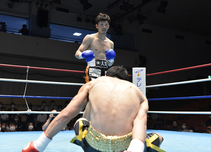 37歳のベテラン、日本ウェルター級4位の出田と日本同級6位の重田によるランカー対決。サウスポーの重田が初回、いきなり左ストレートを炸裂させたダウンを奪った。再開後、重田はさらにジャブ、左ストレートでフラつく出田にさらにダメージを与えると、主審が出田を救う形で試合終了。重田は8勝5KO2敗1分。出田は15勝8KO16敗1分。
