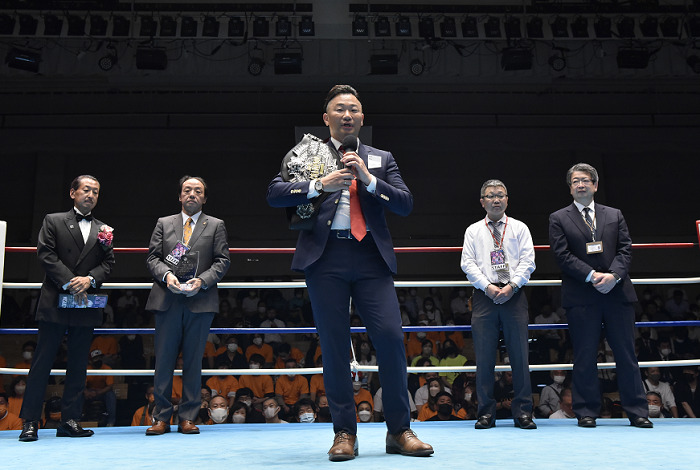 引退式で鈴木は「引退届を出してから1年以上たっている。今、自分は終わったと実感が湧いて寂しく思っています。プロになってから何度もけが、試合の延期した。そのたびに支えてくれる後援者、家族、友人に支えていただいたおかげでベルトを持つことができた。振り返ってありがとうございました、感謝の言葉しか出ないボクシング人生でした」とあいさつ。惜別の10ゴングが鳴らされた。