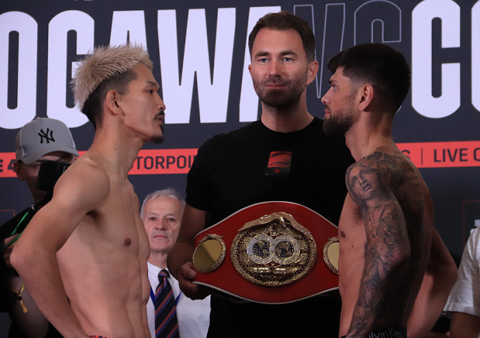 IBF世界S・フェザー級タイトルマッチの計量が3日、ウェールズのカーディフにあるカーディフ・シティ・ホールで行われ、チャンピオンの尾川堅一(帝拳)が129.55ポンド(58.75キロ)、挑戦者3位のジョー・コルディナ(瑛)が129.95ポンド(58.93キロ)で合格した。
