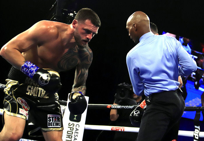 出だし仕掛けたのはスミスだった。前進して左ジャブから右につなげる。しかし初回途中からパンチが当たり出したベテルビエフがラウンド終了間際、右オーバーハンドを振るうとスミスがヒザを着きカウントが入る。