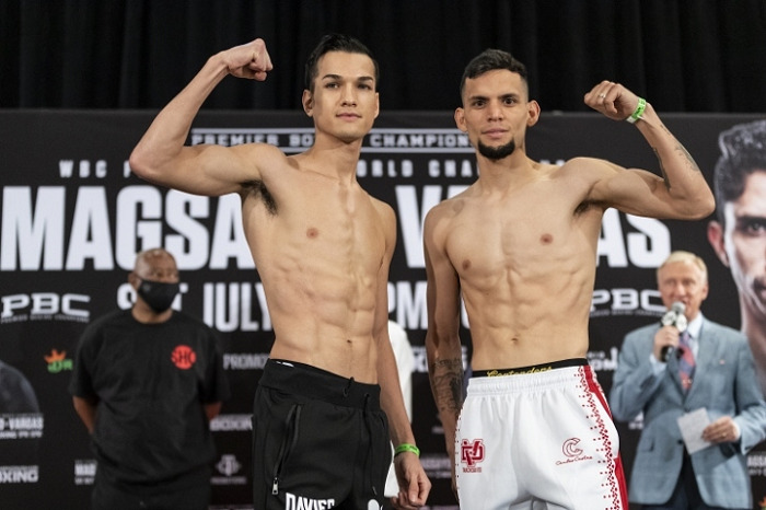 あす9日(日本時間10日)、米サンアントニオのアラモドームで開催されるプレミア・ボクシング・チャンピオンズの計量が8日行われ、メインのWBCフェザー級タイトルマッチは、王者マーク・マグサヨ(フィリピン)と挑戦者レイ・バルガス(メキシコ)がともに125.5ポンド(56.92キロ)で合格した。