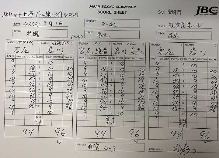 IBF女子アトム級タイトルマッチ10回戦が1日、後楽園ホール「Queens Crest2022」のセミで行われ、挑戦者で前WBO同級王者の岩川美花(姫路木下)が王者の宮尾綾香(ワタナベ)に3-0判定勝ち。スコアは96-94×3。宮尾は初防衛に失敗した。