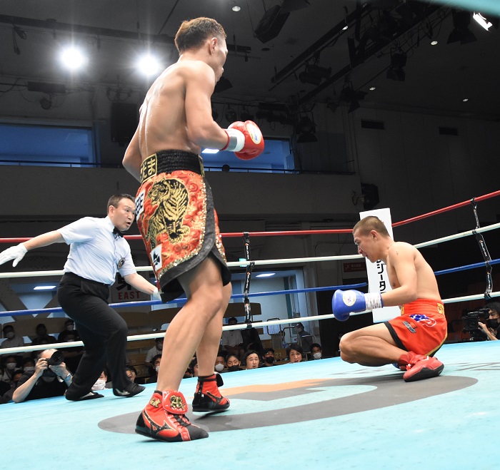 赤穂がシャープな左を連射してスタート。ダプドンはガードと距離をとって守るが、そこに赤穂の右リターンが入ると、少し後退。両者のパワー差は顕著で、その後赤穂が左フックを見舞うとダプドンはその場にダウンだ。