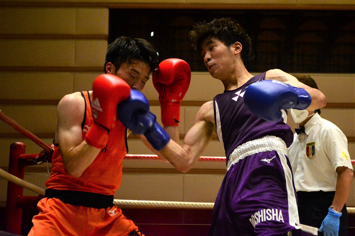 大沢(左)の攻勢で西永が顔面から出血