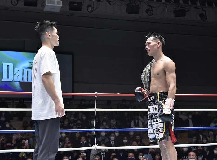 少し距離を置いてフェイスオフする堤㊨と次期挑戦者の南出