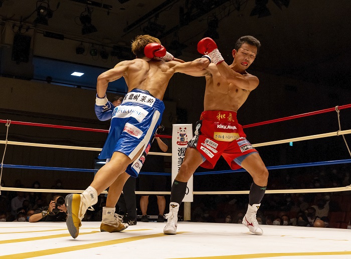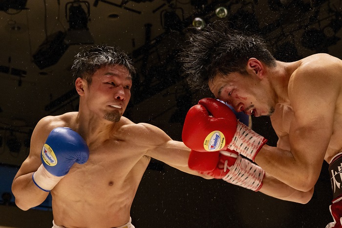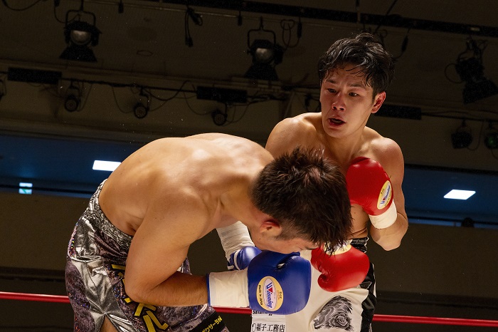 このピンチを坂井はしのぐと4回から反撃開始。距離を詰めて左右のボディ、アッパー、右ストレートで重田を追い込んでいく。重田は足が止まり、一転して劣勢となった。ここからは坂井が攻め、重田が耐えるという展開。坂井は優勢ながらダメージがあるのか、一気に重田を押し切るまではできない。最終回は重田が踏ん張って終了。