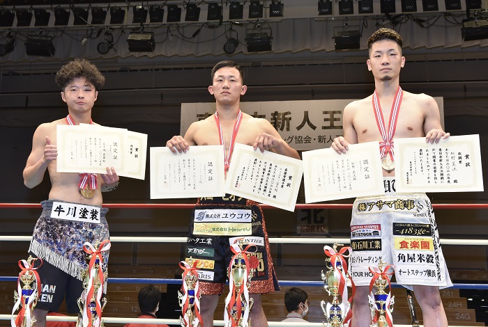 敢闘賞に選ばれたのは、ウェルター級優勝の松野晃汰(神奈川渥美)。4戦4勝4KOの注目選手、磯谷大心(輪島功一S)を4回TKOで撃破。本田秀伸会長の神奈川渥美ジムとして初の新人王である。松野は3勝2KO。