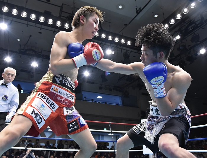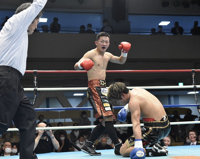 サウスポーの長沼は左もリードにチョンチョンと使いつつ、脚で川口のプレスをさばく。それでもしつこく出た川口は2回に右をねじ込んでダウンをマーク。長沼に深刻なダメージはうかがえなかったが、川口はさらに自信を増して出、3回は右アッパーのダブル-外から右フックと渋い攻め。最終回にダウンを奪い返されたものの、判定で勝利した。