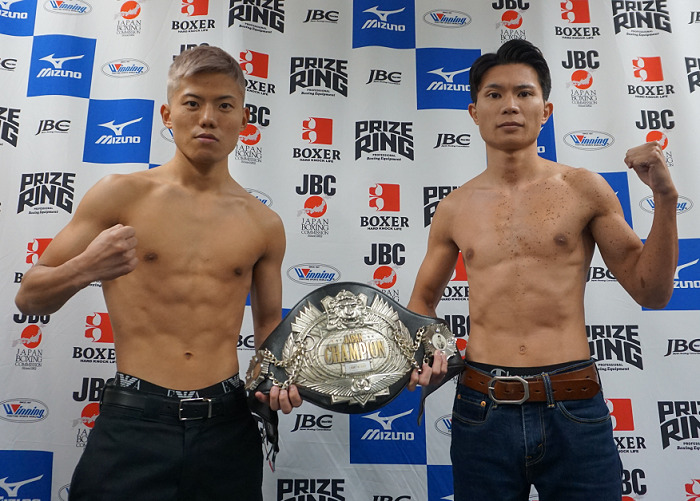 セミの日本ミニマム級王座決定戦は、同級1位の重岡優大(ワタナベ)が47.5キロ、2位の仲島辰郎(平仲BS)が47.4キロでリミットの47.6キロをクリアした。