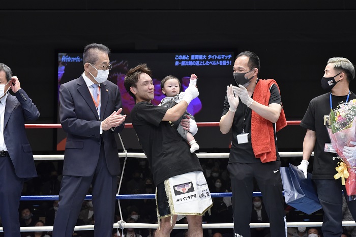 マイクを握った久我はすべての関係者に感謝の意を示した上で、「最高のボクシング人生にしてもらった。1月が最後の試合でしたが、3月に子どもが生まれまして、これからはこの子のためにもがんばりたいと思います」と愛息を胸に抱いてあいさつ。引退の10カウント・ゴングを聞いた。