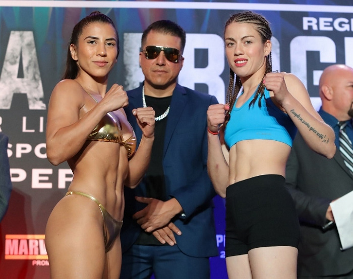 セミではIBF&WBO女子世界ミニマム級チャンピオンのヨカスタ・バジェ(コスタリカ)が2階級制覇を目指してIBF&WBO女子世界L・フライ級チャンピオンのイブリン・ベルムデス(アルゼンチン)に挑戦する。IBF王座は7度目の防衛戦となるベルムデス(17勝6KO1分無敗)は106ポンド(48.07キロ)、ゴールデンボーイ・プロモーションズ傘下のバジェ(26勝9KO2敗)は107.4ポンド(48.72キロ)をマークしリミットの108ポンドをパスした。