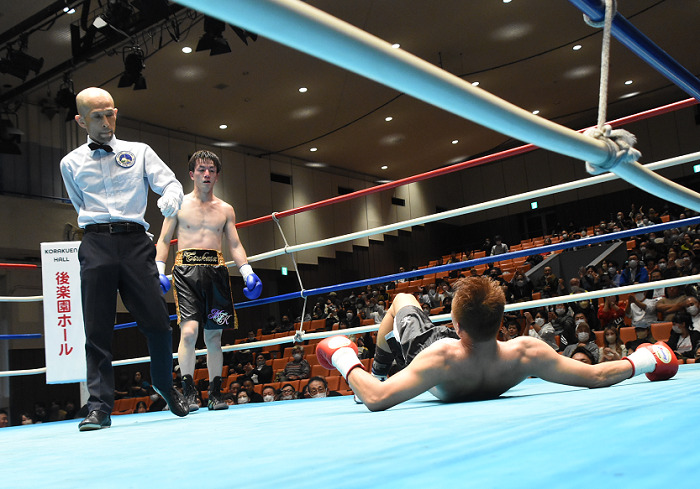 開始わずか30秒、ボディに左を2発打ち込んだサウスポー宮本が続けて左フックを放つと、濱口がキャンバスに崩れ落ちた。立ち上がった濱口はここからボディ打ちなどで反撃に出るが、宮本は左ストレートから右フックを振り抜いて再び濱口をキャンバスへ。濱口はゴングに救われた。