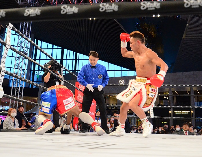 両者の攻防のピッチが上がった。そしてカシメロが左フックのダブルからさらに突進したところを、赤穂がいなしながら左フックを引っかける。前のめりになってグローブをついたカシメロにダウンが宣告された。