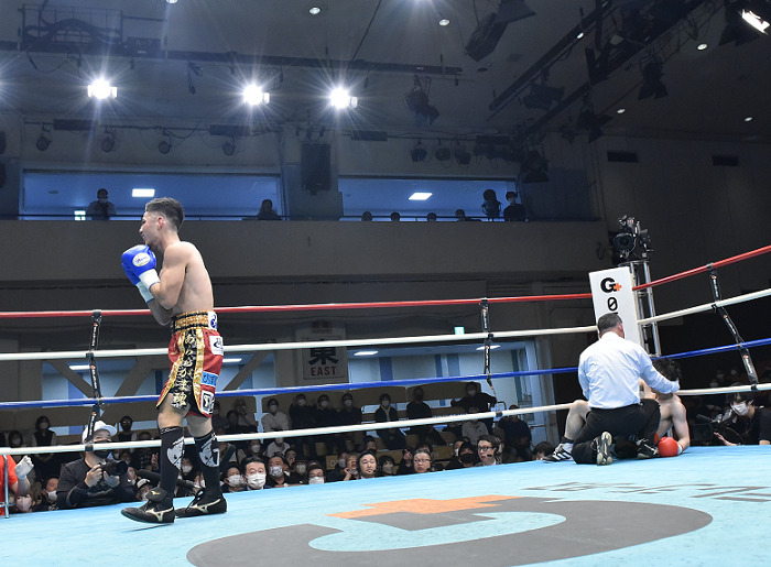 初回、秋間が右ストレートを決めて先制した。髙橋は飛び込んでの左フック、距離を詰めてボディ攻撃で秋間に迫ったが、秋間は2回にも右ストレートをクリーンヒット。巻き返そうとする髙橋に対し、最後もワンツーをきれいに決めて髙橋をキャンバスへ。主審がノーカウントで止めた。秋間は6勝4KO4敗2分。昨年の東日本新人王、髙橋は4勝2KO2敗。