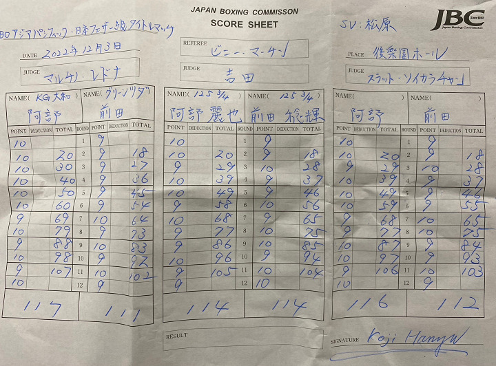 8回、前田が少し前のめりになる。前田の右が当たるが、阿部が離れ際の左フック、中間距離からの左ストレートで流れを渡さない。9回は前田が打ち終わりに左を打ち込む。終盤は前田が攻めの姿勢を見せるものの、阿部がさばいて、さばいて、ジャブを決めるというボクシング。最終回、前田の攻撃をしのいだ阿部が辛くも逃げ切った。