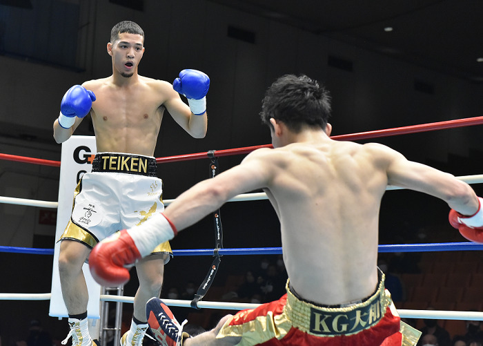 狩俣がガードを固めて前進し、日本同級7位の安藤がサイドに動きながらジャブに右フックで狩俣をコントロールしようとした。安藤が好スタートを切ったかに見えたが、狩俣は3回、右をヒットするとチャンス到来。安藤が立て直したかに見えたが、狩俣が右フックから左フックを決めて安藤がキャンバスに沈んだ。