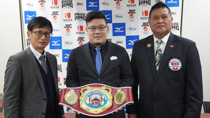 3人は日本プロボクシング協会がボクシングアパレルrcs productsと共同製作した袴田さん支援パーカを着て弁護士会館に登場。こちらも協会作製の応援グッズであるオリジナル缶バッジを東京高裁で最後の意見陳述を控える弁護団と厳さんの姉、秀子さんにプレゼントした。