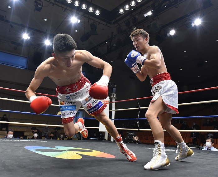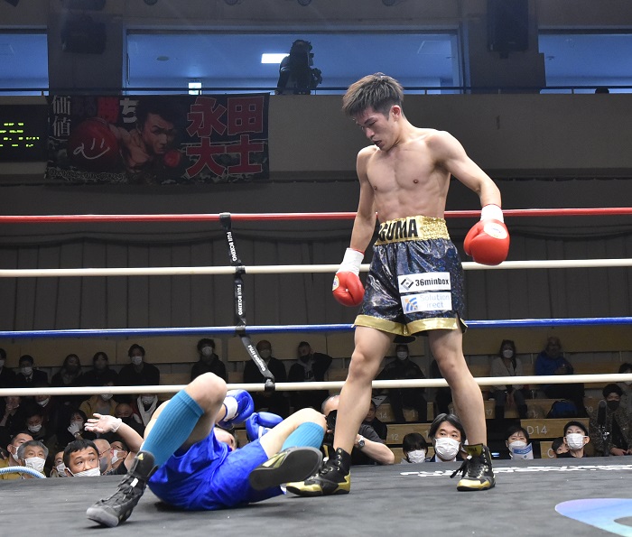 両者は20年12月、日本王者だった永田に近藤が挑戦し、7回負傷ドローに終わって以来の再戦。先に仕掛けたのはサウスポーの永田。アグレッシブに左を打ち込んでいった。しかしラウンド後半、近藤の右フックで永田がバランスを崩してグローブをキャンバスにつくと、永田はスリップをアピールしたもののダウンの裁定となった。