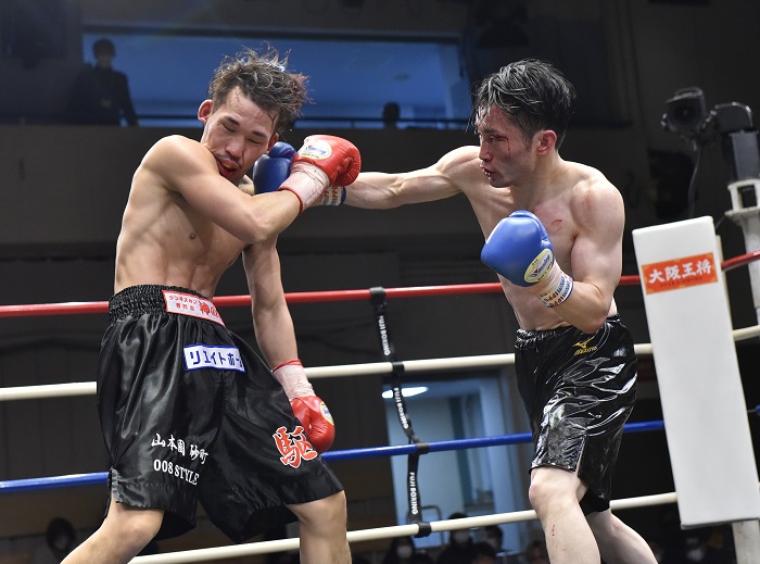 初回から激しい打ち合いとなった。藤野は左ボディ、左フックを軸にグイグイと押し、大場も右アッパー、左フックで応戦した。初回は藤野が押したが、3回は大場が右ストレートから見せ場をつくって打撃戦はヒートアップ。この回、藤野がバッティングで左目上を切った。