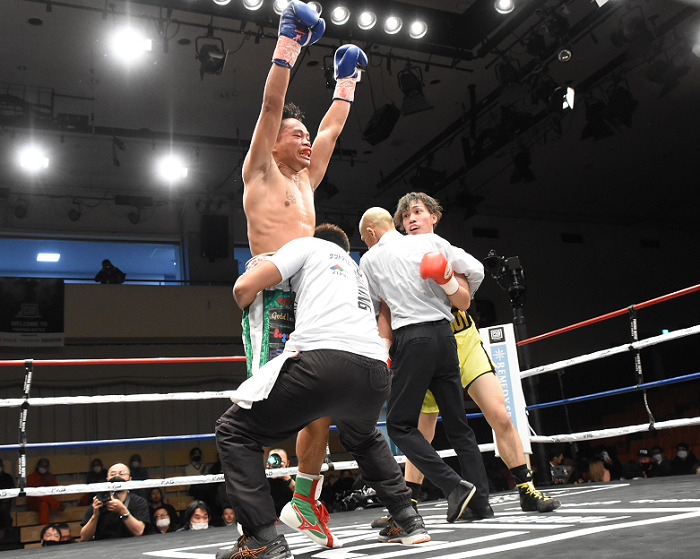 ダメージのなかったスムガットはここから左のリターンを狙ったり、距離を詰めたりとベテランらしくあの手、この手を使っていく。のらりくらりのスムガットに手を焼いていた今永は6回、右フックを打ち込んできたスムガットに左カウンターを見舞い、10カウントを聞かせた。今永は3勝3KO。スムガットは14勝7KO13敗1分。