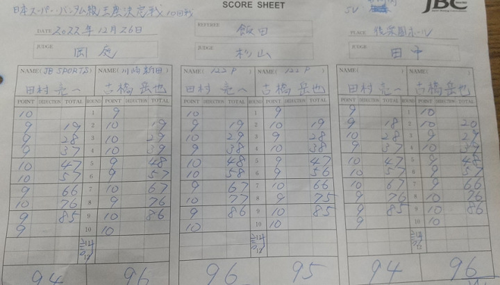 最終回も互いに譲らずに打ち合って終了のゴング。静寂の中、読み上げられたスコアはわずかの差で古橋に軍配が上がった。古橋は29勝16KO9敗2分。田村は15勝7KO7敗1分。