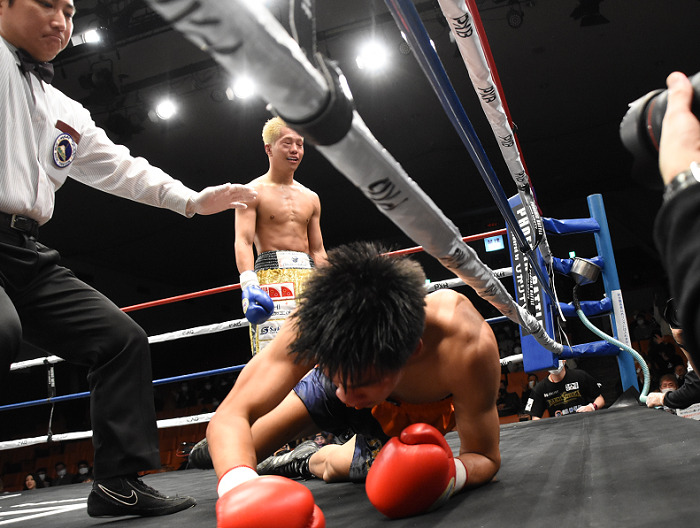 3回も接近戦を挑んだ湯川は右フックでテンプルに叩き込んでパラミンをなぎ倒す。最後は左フックをカウンターで叩き込み、2度目のダウンでストップとなった。湯川はデビューから無傷の7連勝5KOをマーク。18歳おパラミンは10勝8KO6敗。