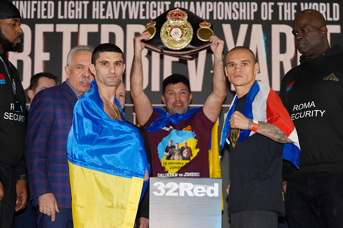 明日28日(日本時間29日)ロンドンのOVOアリーナ(ウェンブリーアリーナ)でゴングが鳴るL・ヘビー級3団体統一タイトルマッチの計量が27日行われ、IBF&WBC&WBO統一L・ヘビー級王者アルツール・ベテルビエフ(ロシア=カナダ)が174.5ポンド(79.15キロ)、挑戦者アンソニー・ヤード(英)が174.25ポンド(79.04キロ)を計測。リミットの175ポンドに合格した。