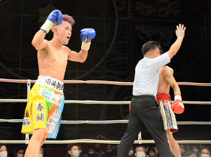 1回、伊佐が右ストレートでダウンを奪うも、表が2回と4回に右をヒットしてダウンを奪うスリリングな展開。リードを奪われた伊佐はショートパンチを上下に打ち分け、表の体力を削り、7回にロープを背負わせて一気の連打、ストップを呼び込んだ。伊佐は11勝2KO5敗1分、表は9勝3KO5敗。