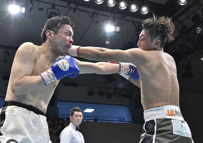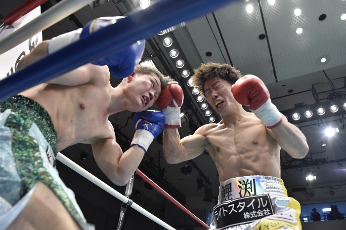 日本ライト級4位の鯉渕が初回から仕掛け、日本S・フェザー級8位のサウスポー長谷川に迫った。これをしのいだ長谷川に対し、鯉渕は2回に入るとさらにギアを上げ、コーナーに長谷川を押し込んで連打。右でダウンを奪った。立ち上がった長谷川に鯉渕が襲いかかり、最後は右ボディで倒して10カウントを聞かせた。鯉渕は昨年10月、日本タイトル挑戦者決定戦で仲里周磨(オキナワ)に惜しくも敗れてからの再起戦に勝利。9勝8KO6敗1分。長谷川は15勝10KO5敗1分。