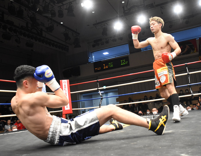 中央大出身で昨年B級デビューした田中のプロ2戦目はサウスポー対決。体格で上回る田中はリターンを狙うスパーポンのパンチを足で外しながらジャブ、左ストレートで迫った。2回に左カウンターをヒット。3回以降、田中は攻勢を強めてジャブ、左、右フックで攻めていくが、タフなスパーポンはよく手を出して抵抗した。5回、左カウンターを決めた田中はラッシュ。コーナーでグラついたスパーポンを主審が救った。田中は2勝1KO。スパーポンは3勝2KO2敗。