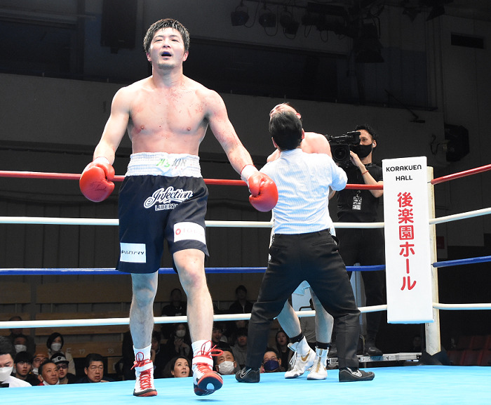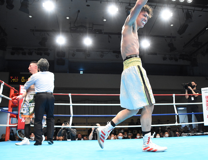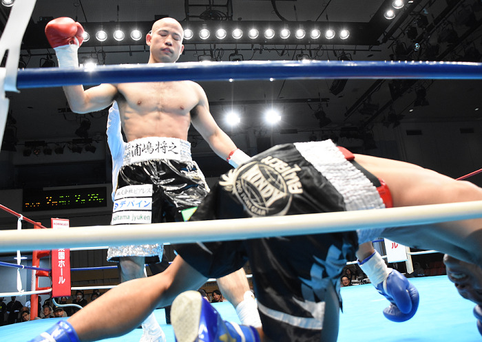 浦嶋はガードを固めるブンチュアイを初回から一方的に攻め、まずはボディ攻めから右フックでダウン。2回にも右を打ち下ろして試合を終わらせた。拓大で活躍後、家業の漁師を手伝い、警視庁の警察官をへてプロ入りした浦嶋が初陣を飾った。ブンチュアイは6勝4KO3敗1分。