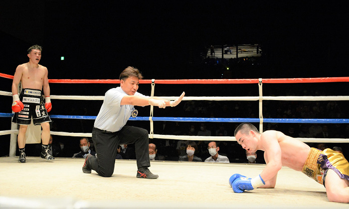 セミのS・バンタム級8回戦は、日本同級6位デカナルド闘凜生(六島)がジャブから丁寧に攻め続け、5回に左フックを坂本佳朗(本多)の顔面にヒット、うつぶせに倒れた坂本はなんとか立ち上がるも足元がふらつきカウントアウトされた。