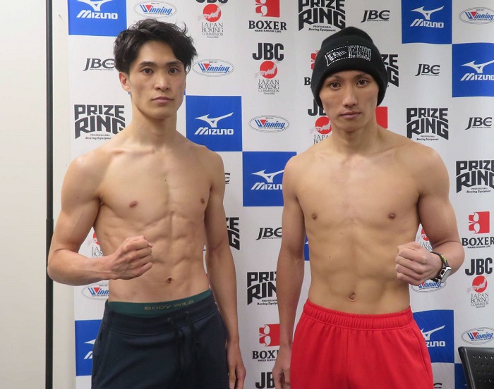 あす後楽園ホールで行われる注目の日本フェザー級王座決定戦の前日計量が行われ、同級1位の佐川遼(三迫)と同級2位の松本圭佑(大橋)がともにリミットの57.1キロでクリアした。