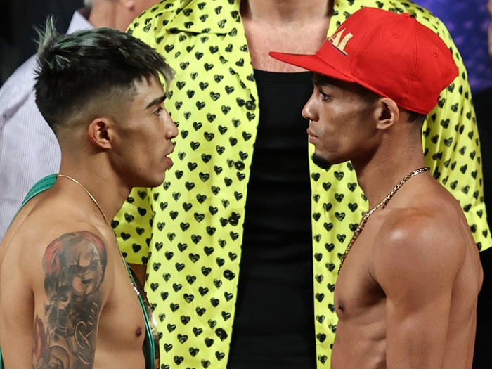 セミではWBCフライ級者フリオ・セサール・マルティネス(メキシコ)がロナル・バティスタ(フィリピン)を相手に5度目の防衛戦。両者ともフライ級リミット112ポンド(50.80キロ)を計測。マルティネス(19勝14KO2敗2無効試合)は無名のバティスタ(15勝9KO2敗)を破り、IBF王者サニー・エドワーズ(英)との統一戦へ前進を目指す。Photos by Melina Pizano / Matchroom