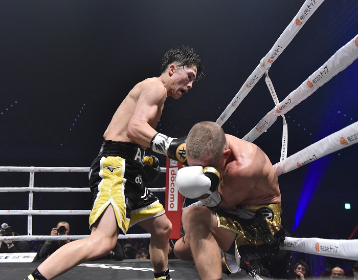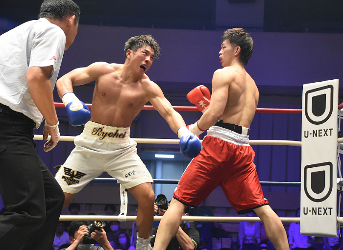 ラグビーの名門、京都成章高ラグビー部出身の伊吹はたくましい肉体を前に出して長身の小林の懐に入り、ボディブロー、左右のフックを激しく打ち込むボクシング。小林も右フックを決め、初回から激しい打撃戦となった。終盤にペースをつかんだのは伊吹だったが、2回は両者ともダメージとガス欠でフラフラに。それでも伊吹が最後は打ち勝ち、小林に右を打ち込んでストップを呼び込んだ。