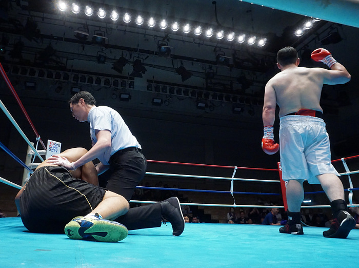 2回、佐々木が主導権を握ってケイを攻めるが、ラウンド後半は両者ともにスタミナが切れてフラフラの状態に。それでも最後は佐々木のパンチでケイがダウン。主審がすぐにストップした。