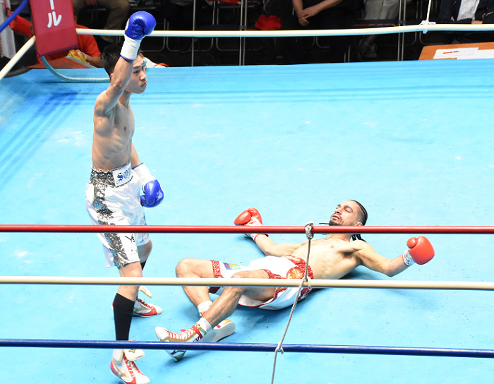 身体を揺すって丁寧にプレスをかける畑中が、サウスポーのチャワドンに、右のブローを上下に合わす。3回、ロープへと追った畑中は、右のボディで最初のダウンを奪うと、再開後もボディの連打でチャワドンにテンカウントを聞かせた。快勝の畑中は、2度のバク宙パフォーマンスを披露した。